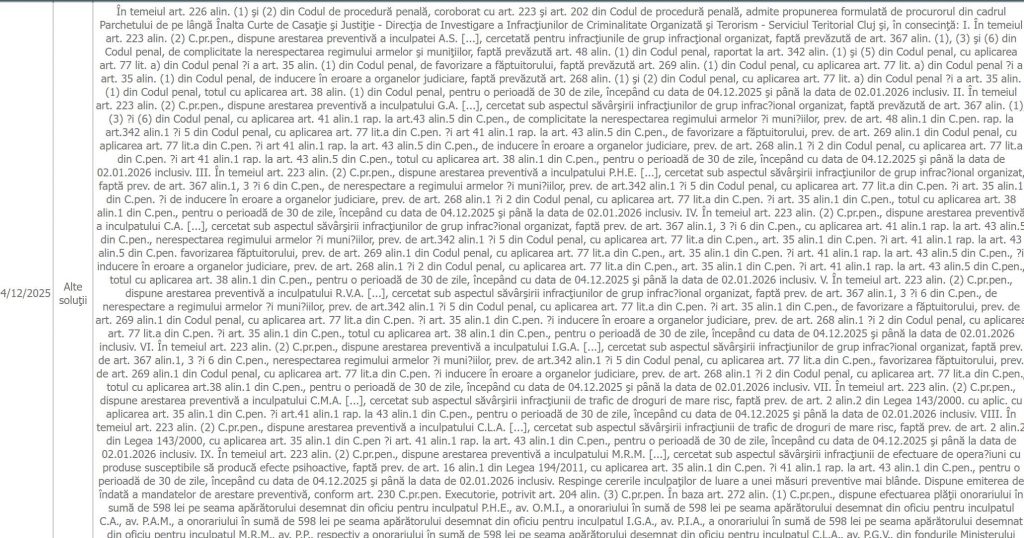 - Astăzi, 4 decembrie 2025, inculpații au apărut în fața judecătorilor de la Curtea de Apel Cluj, în cadrul unei ședințe care a început la ora 14:00 și s-a încheiat spre seară. Cei 9 acuzați reținuți ieri, în fruntea cu avocata Sonia Almaș, au fost arestați în seara asta.